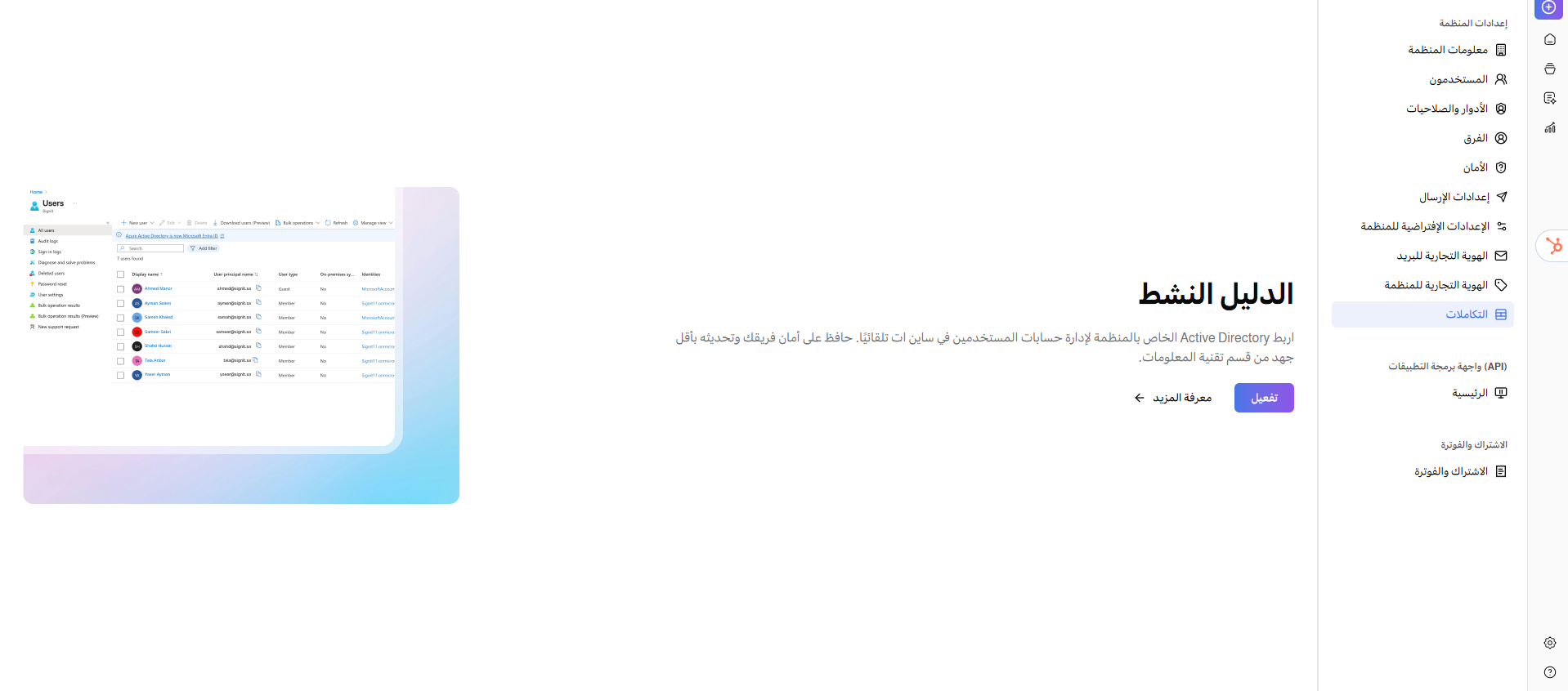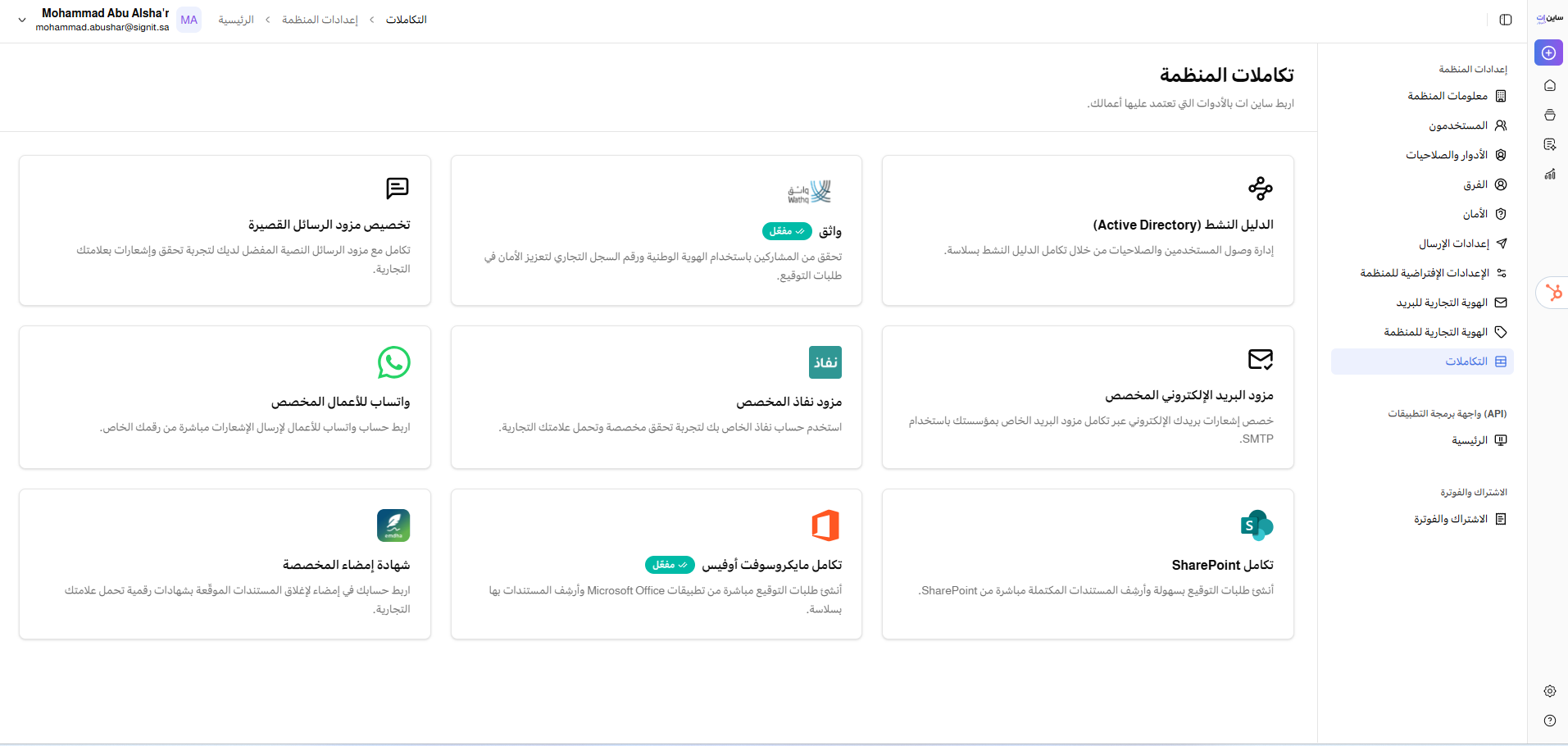 من الصفحة الرئيسية لـ ساين إت، افتح القائمة واختر التكاملات لبدء ربط الأنظمة الخارجية مثل Active Directory.